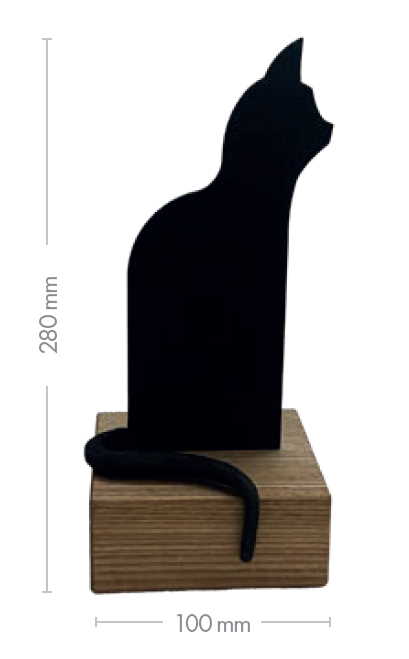 Ručně kovaná dekorace ve tvaru kočky v kombinaci se dřevem.