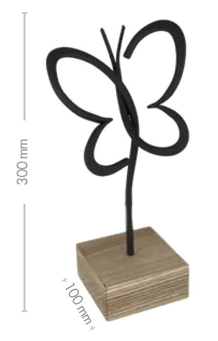Ručně kovaná dekorace ve tvaru motýlav kombinaci se dřevem.