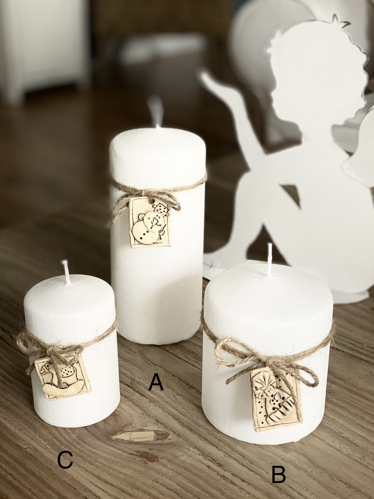 Svíčka je ozdobena keramickou destičkou na provázku.
