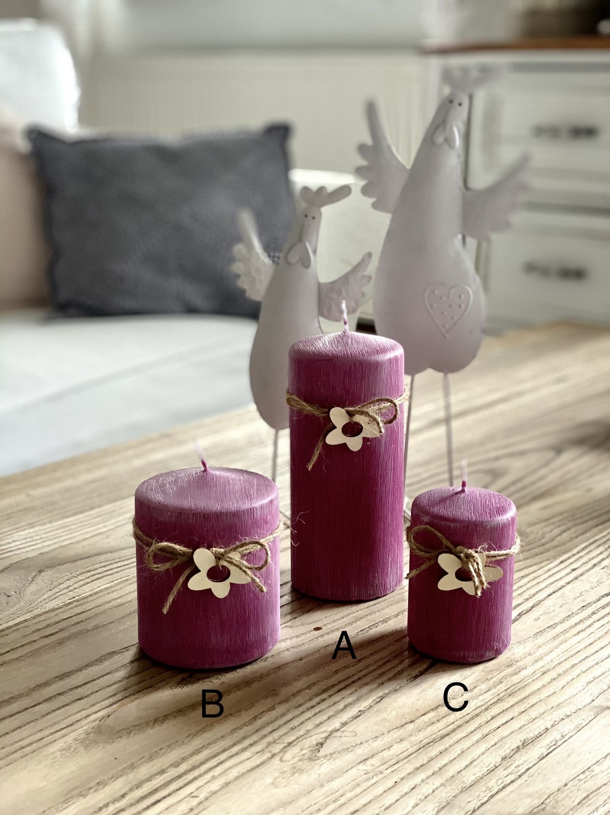 Svíčka je ozdobena dřevěnou kytičkou na provázku.