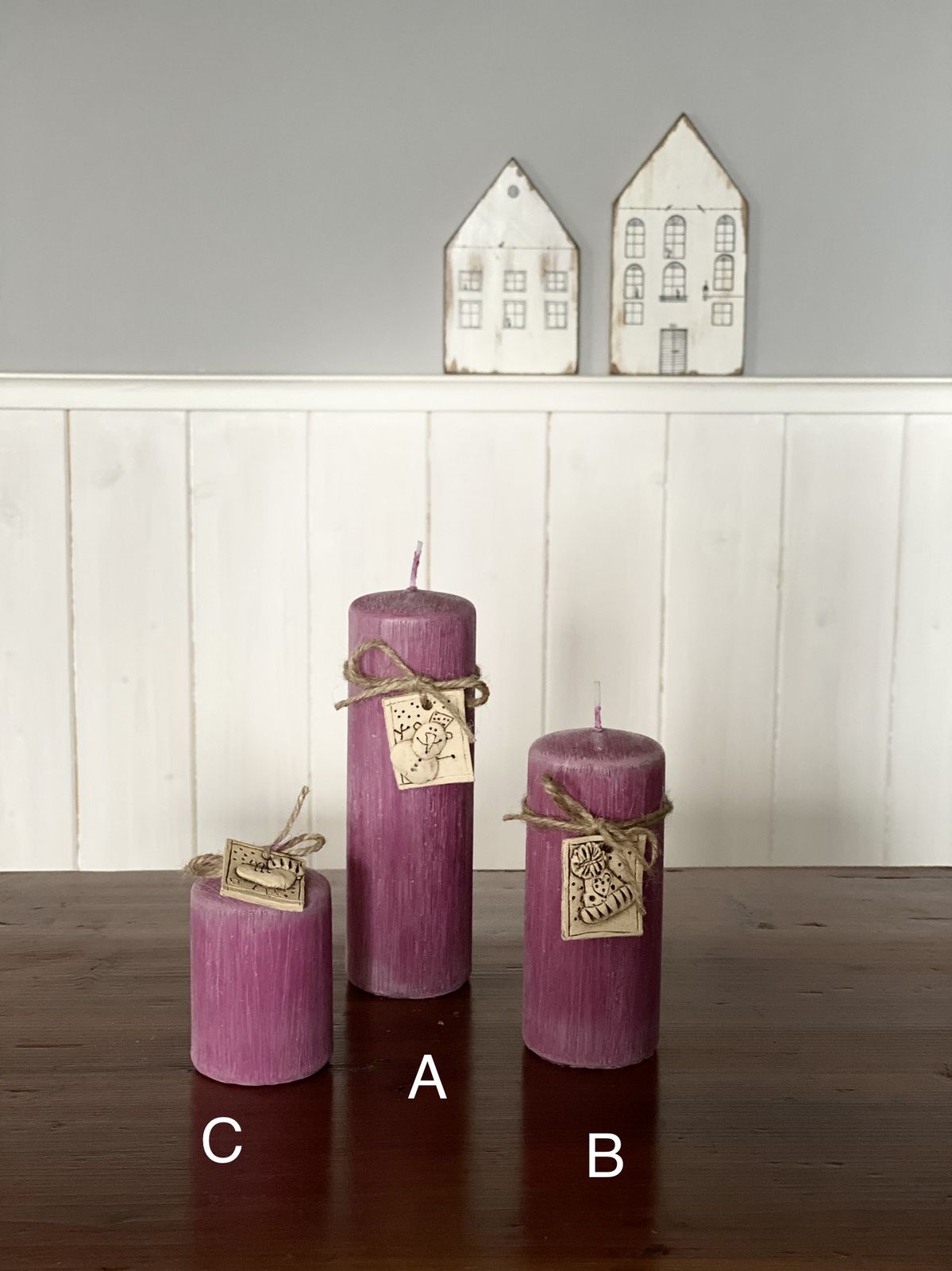Svíčka je ozdobena keramickou destičkou na provázku.