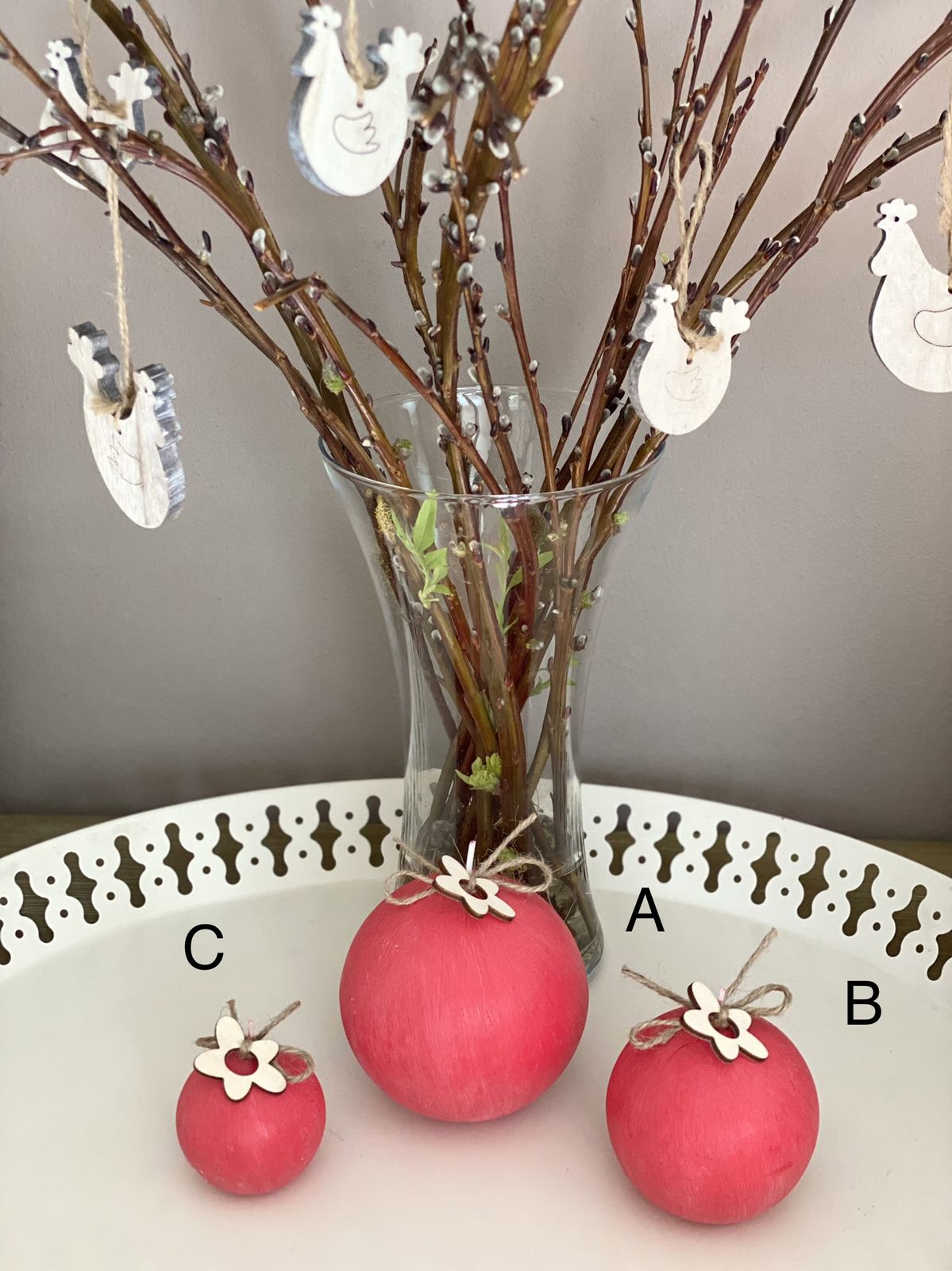 Svíčka je ozdobena dřevěnou kytičkou  na provázku.