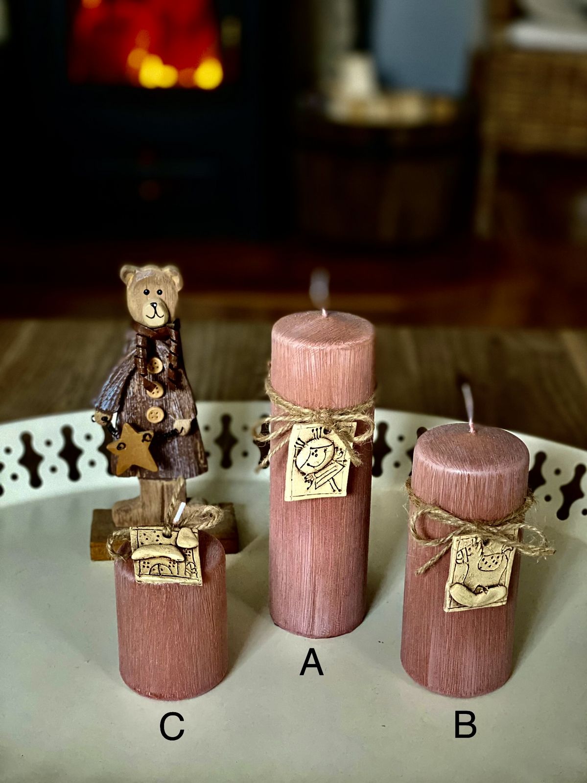 Svíčka je ozdobena keramickou destičkou na provázku.
