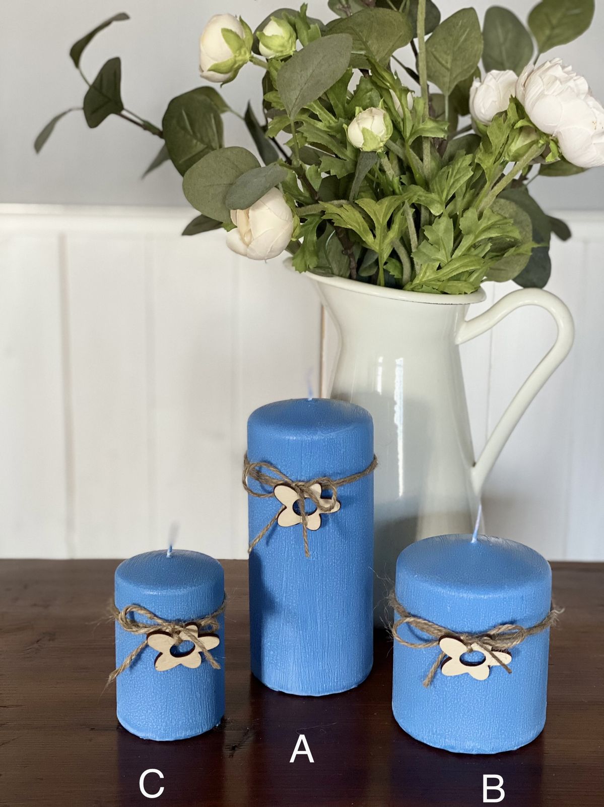Svíčka je ozdobena dřevěnou kytičkou na provázku.