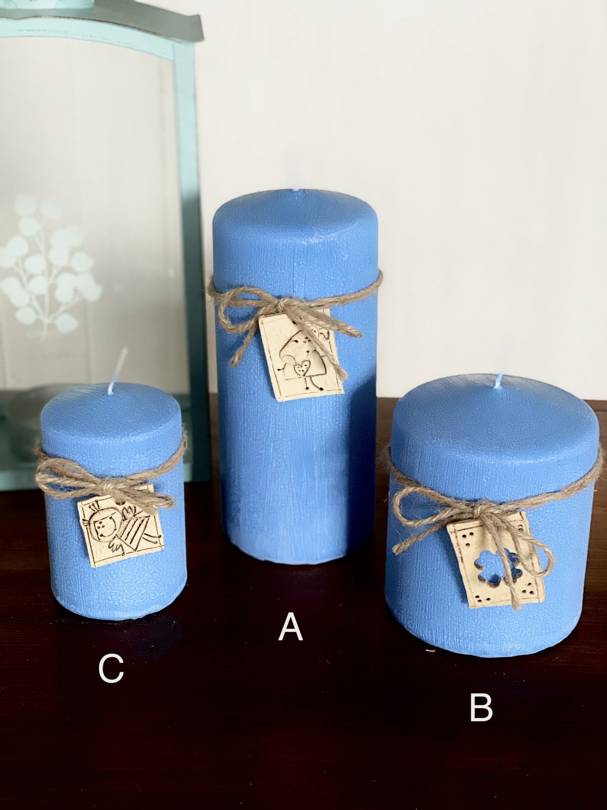 Svíčka je ozdobena keramickou destičkou na provázku.