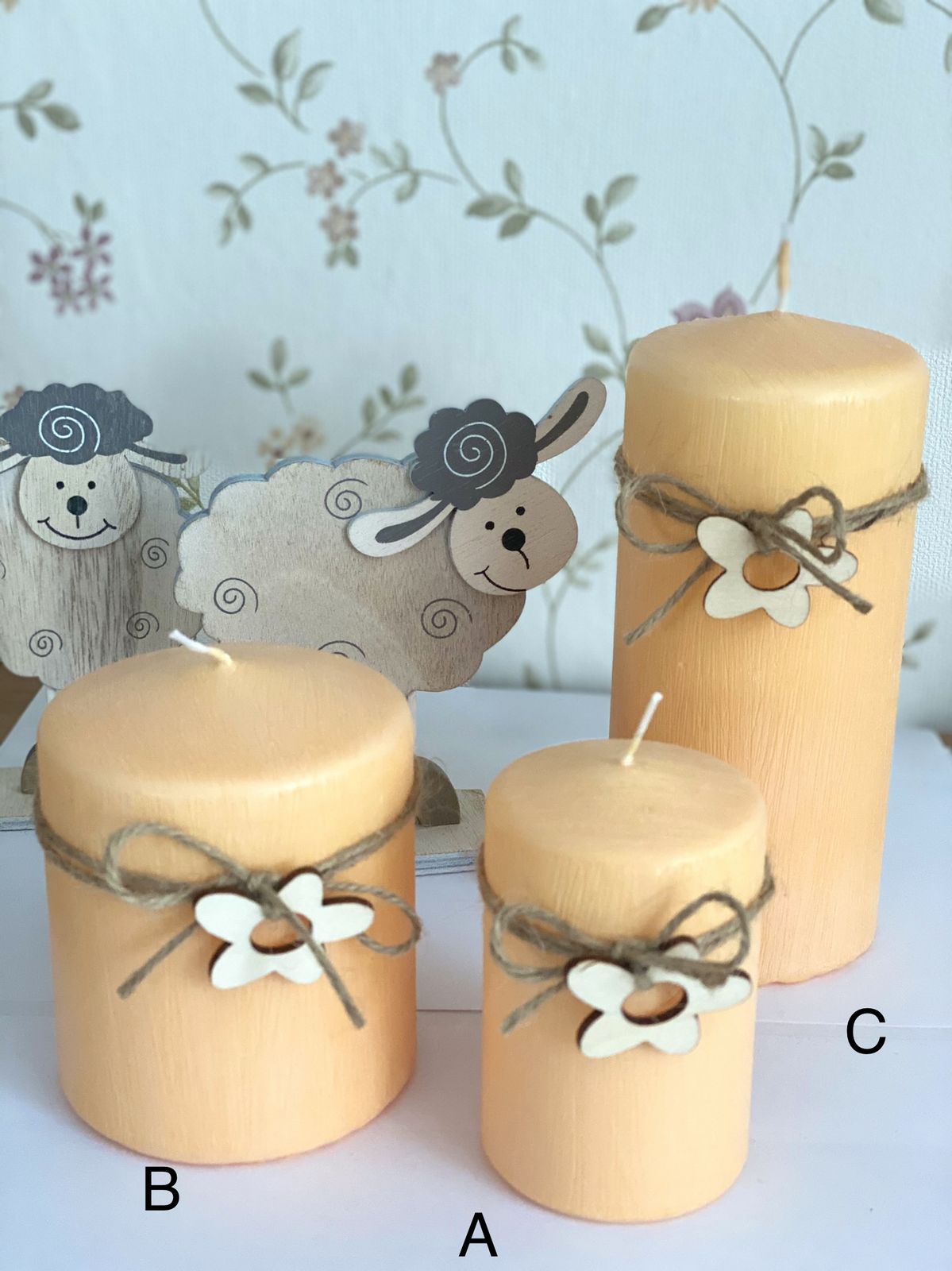 Svíčka je ozdobena dřevěnou kytičkou na provázku.