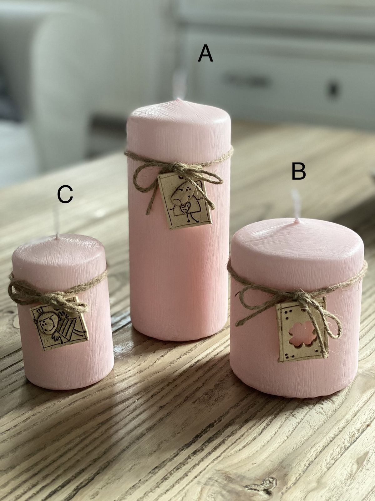 Svíčka je ozdobena keramickou destičkou na provázku.