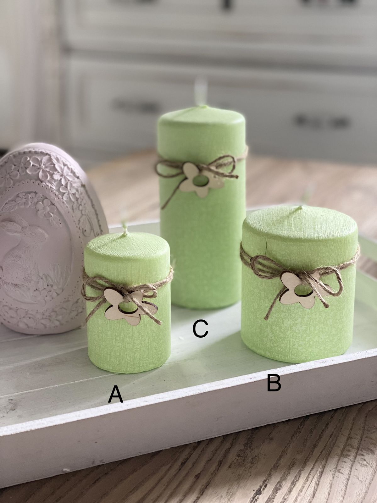 Svíčka je ozdobena dřevěnou kytičkou na provázku.
