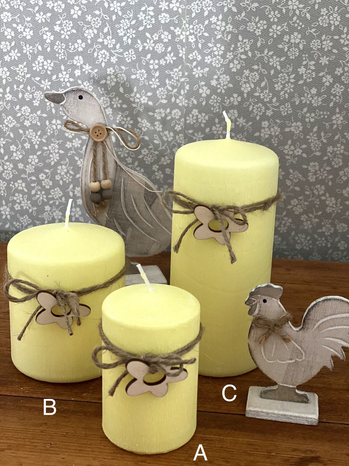 Svíčka je ozdobena dřevěnou kytičkou na provázku.