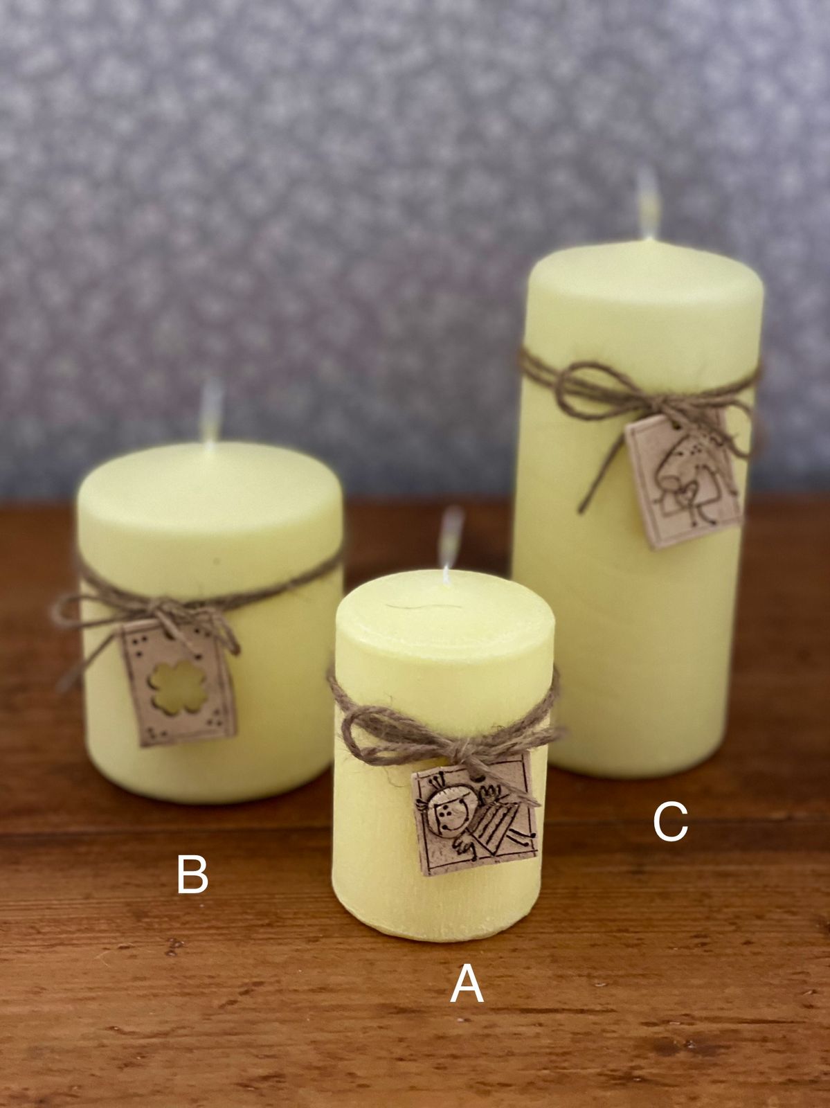 Svíčka je ozdobena keramickou destičkou na provázku.