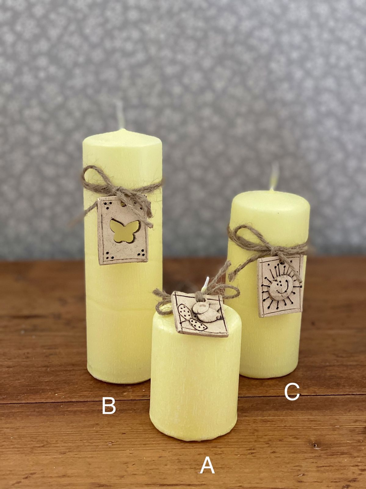 Svíčka je ozdobena keramickou destičkou na provázku.
